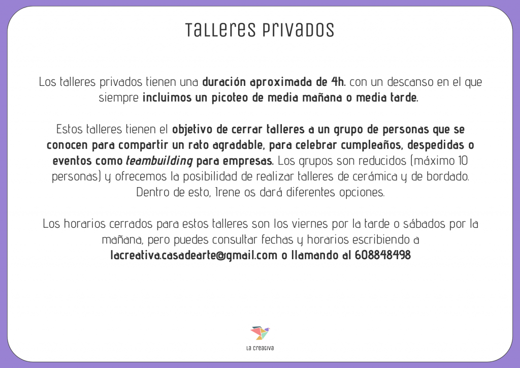 - Grupos privados: consultar tarjetas regalo y tipos de talleres ofertados