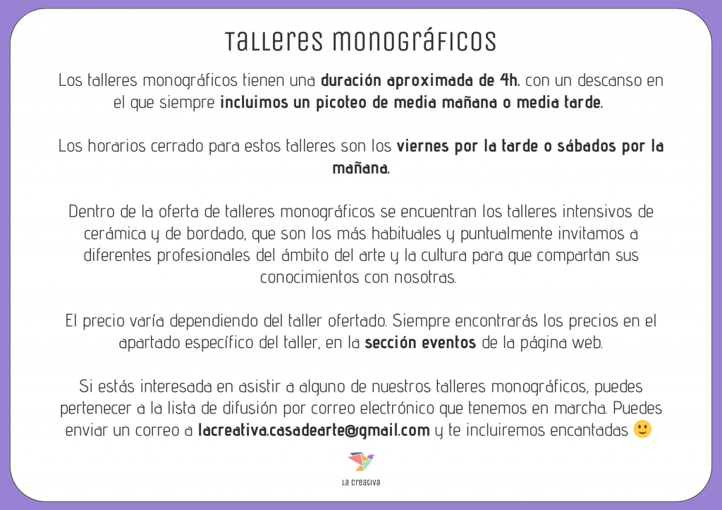 - Bordado: tarifa mínima (270€) o a partir de 6 personas 45€ por persona. Incluye materiales y picoteo