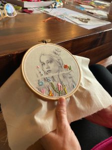 - Los materiales para poder realizar el taller (bastidor, tela, papel transfer, hilos y aguja)